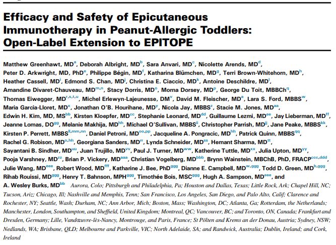Regarding food allergy, peanut allergy is a particularly common and negatively impactful example. Although the classic treatment has been avoidance, the ubiquity of peanut in the diet makes avoidance difficult, and accidental peanut exposure is common and often results in severe reactions. More recently, oral desensitization and omalizumab have been approved for the treatment of peanut allergy, but both treatments come with drawbacks in young children. The second article describes the long-term follow-up of an another form of desensitization, epicutaneous immunotherapy. The study found that after 24 months of epicutaneous peanut patch immunotherapy started in children 1-3 years of age, there was continued enhancement of the treatment effect without additional reports of treatment-related systemic allergic reactions, demonstrating the potential of epicutaneous immunotherapy to be a safe and efficacious treatment option for the management of young peanut-allergic children